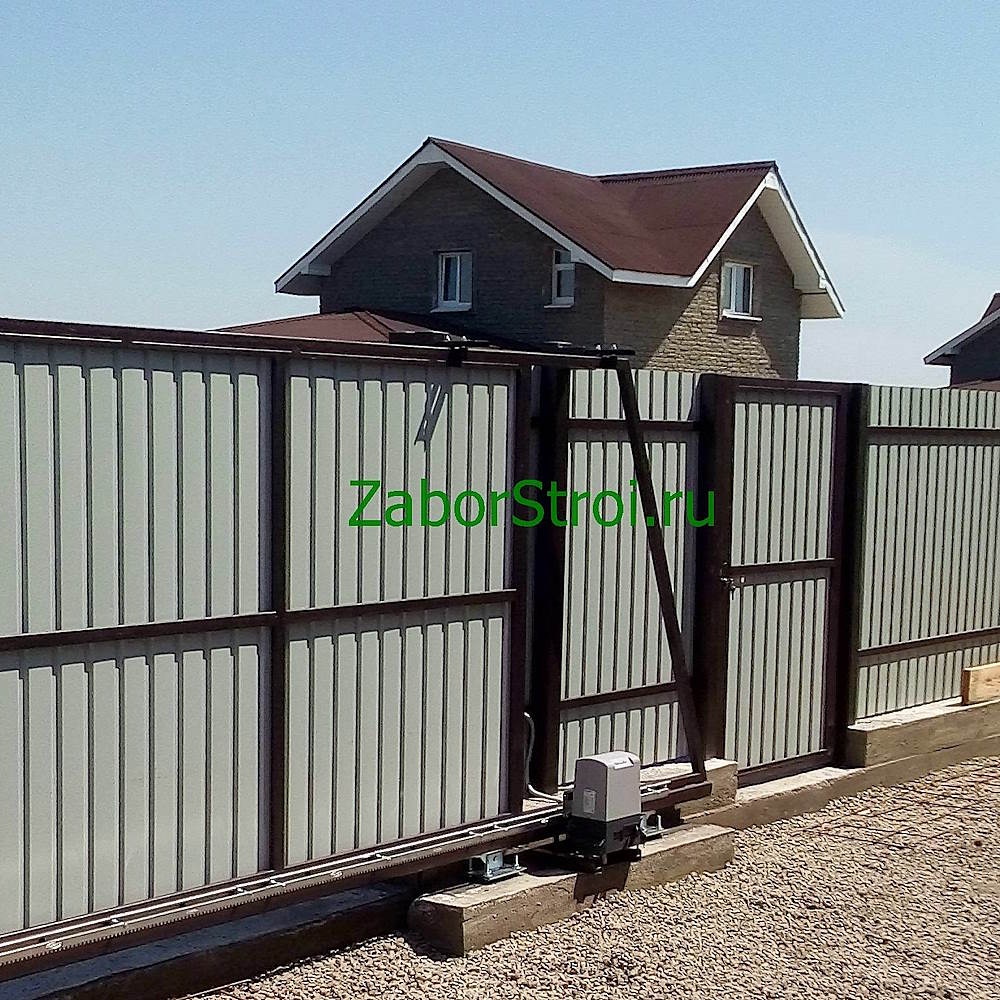 Откатные ворота из профнастила с встроенной калиткой и автоматикой